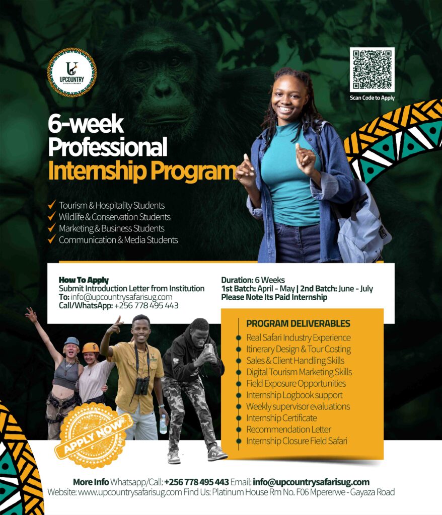 Gain real-world safari experience with one of Uganda’s trusted and fast-growing tour operators. The Upcountry Safaris Uganda Internship Program is strategically designed to bridge the gap between classroom theory and practical industry execution — transforming academic knowledge into real operational skill.